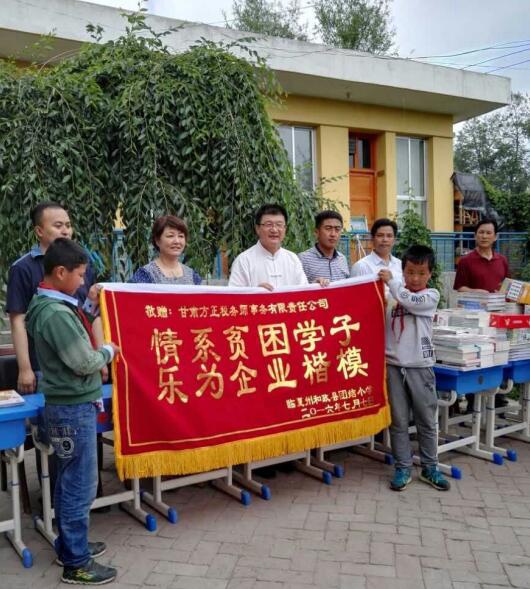 捐贈活動尾聲,受贈學校向甘肅方正稅務師事務所回贈了“情系貧困學子,樂為企業楷?!钡腻\旗。
